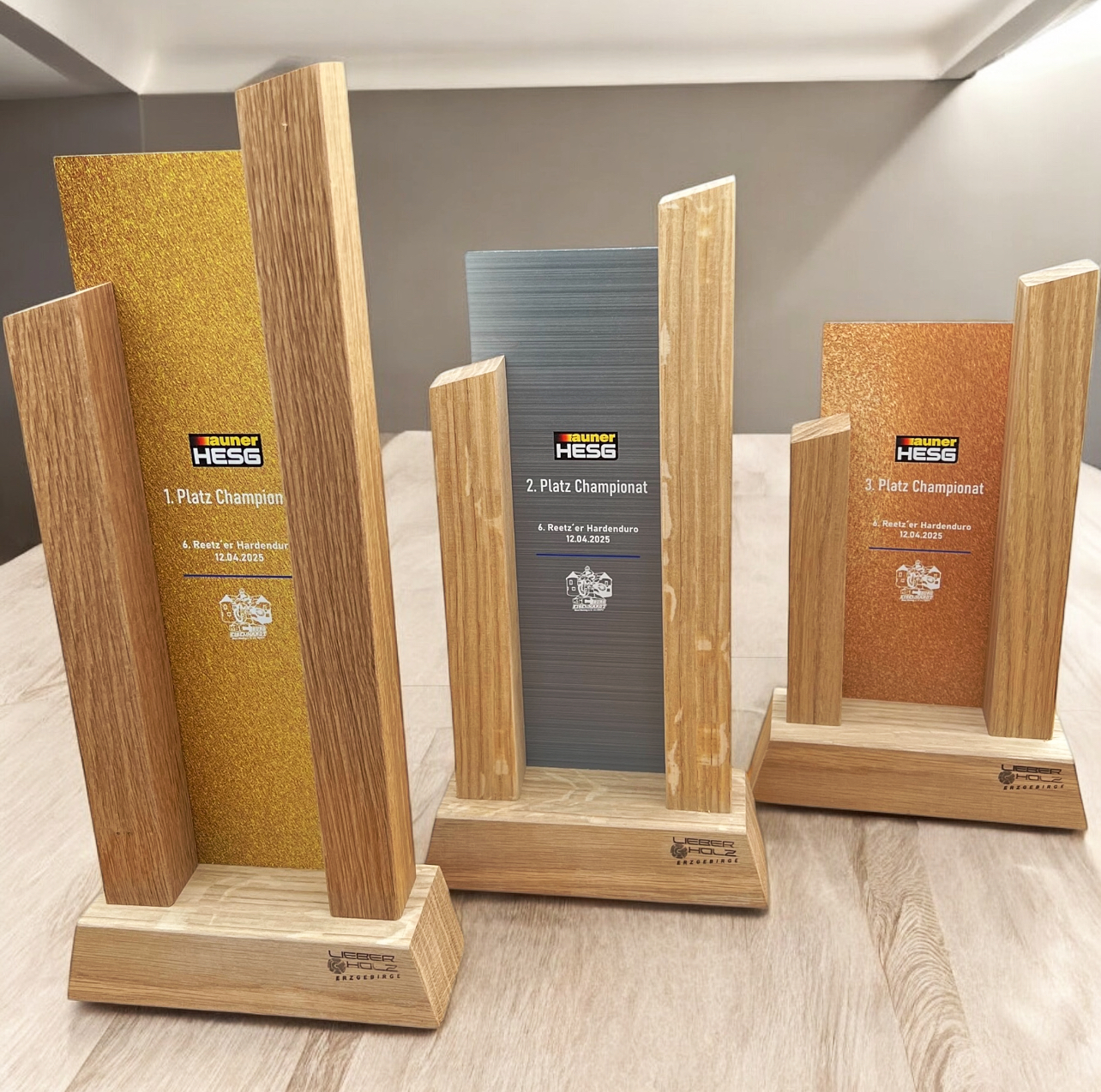 Durch die sorgfältige Auswahl von Eichenholz und Aluminium Dibond entsteht ein hochwertiger Materialmix, der Professionalität und Individualität ausstrahlt. Die Trophäe wirkt gleichzeitig robust und elegant – ideal für Sportevents, Firmenauszeichnungen oder kreative Wettbewerbe.
