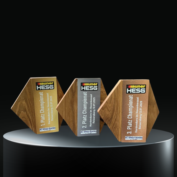 Durch die sorgfältige Auswahl von Eichenholz und Aluminium Dibond entsteht ein hochwertiger Materialmix, der Professionalität und Individualität ausstrahlt. Die Trophäe wirkt gleichzeitig robust und elegant – ideal für Sportevents, Firmenauszeichnungen oder kreative Wettbewerbe.