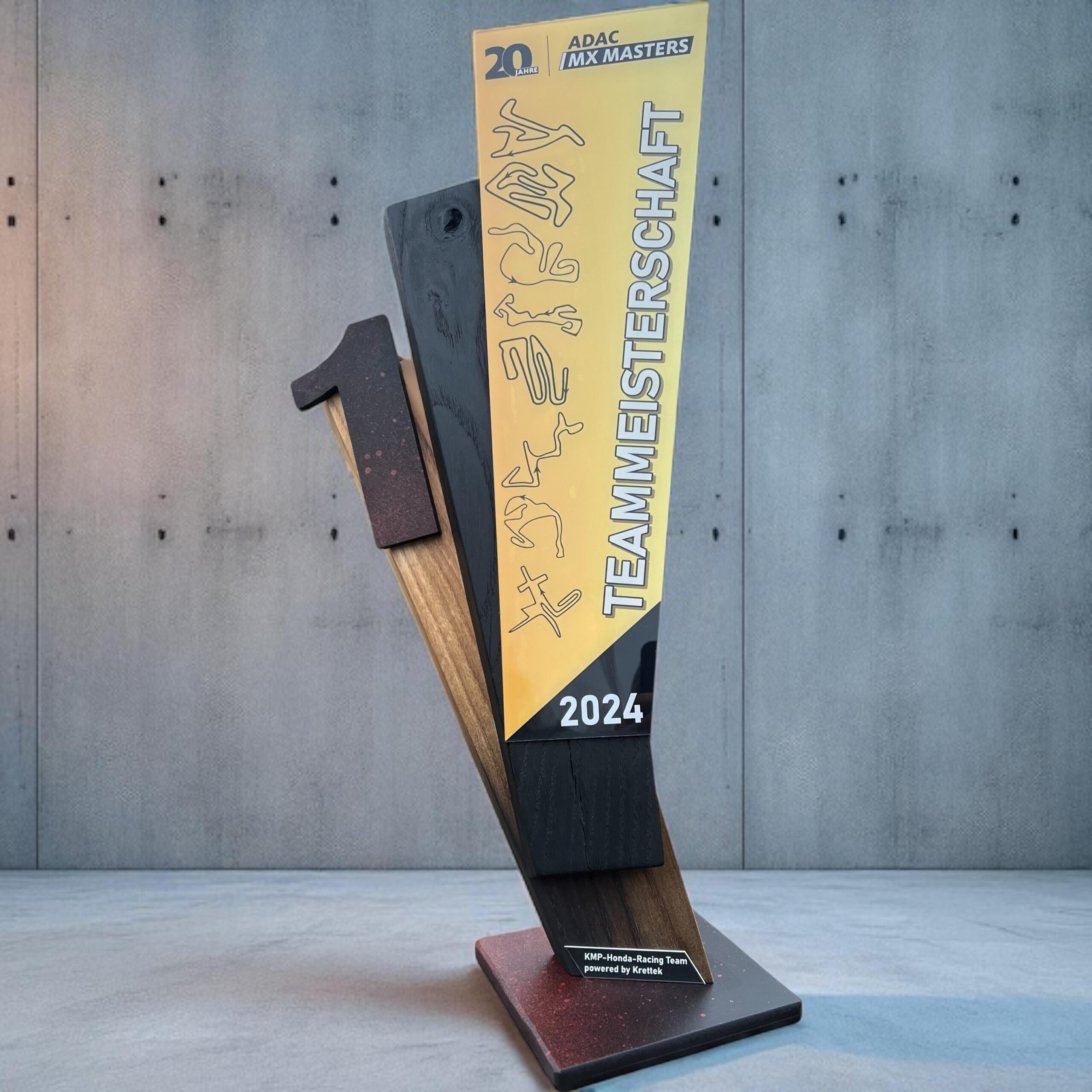 Die plakative Frontfläche bietet Raum für Gravur, Logo oder Sponsoring – elegant eingefasst und kontrastreich in Szene gesetzt. Der metallische Fuß sorgt für sicheren Stand und optisches Gegengewicht.