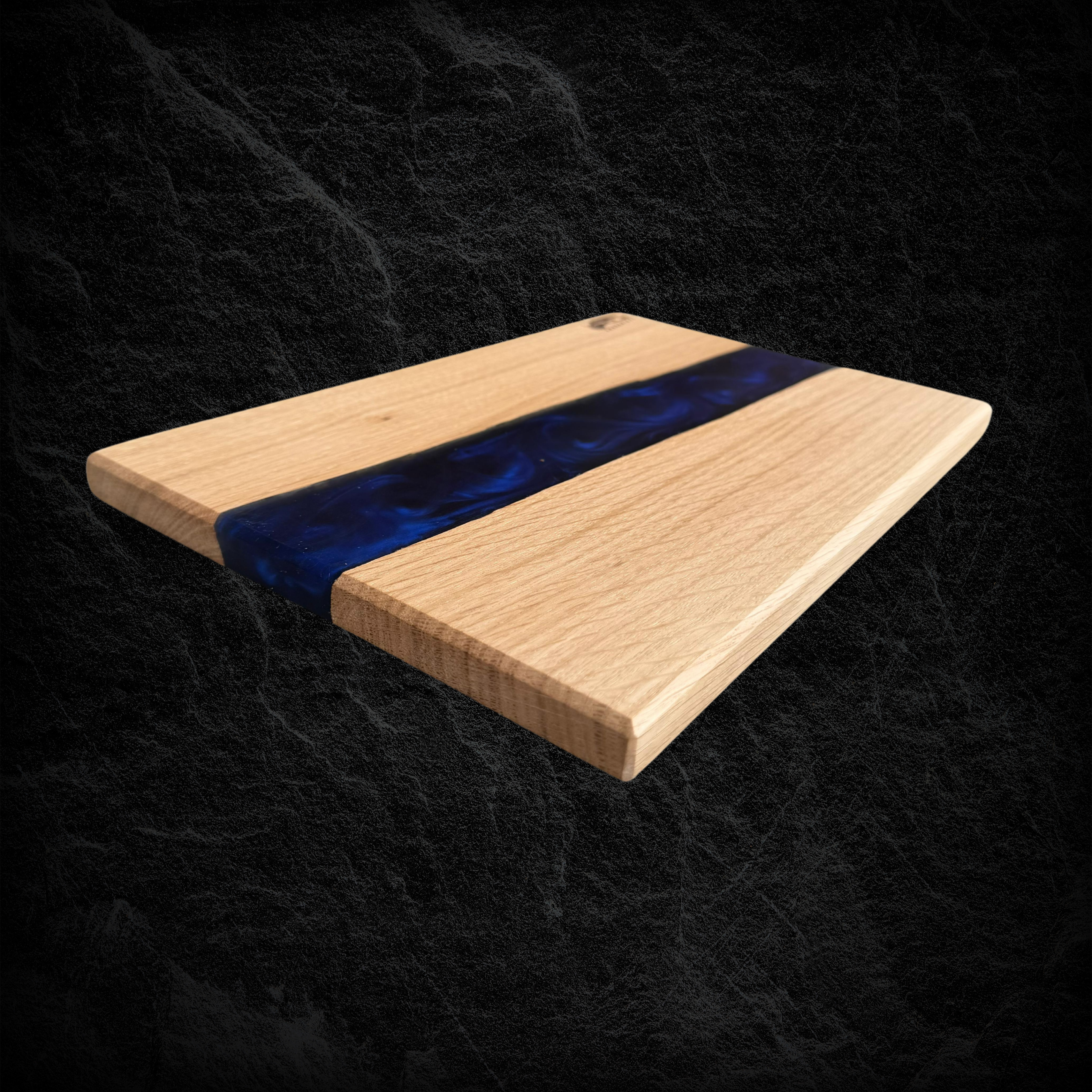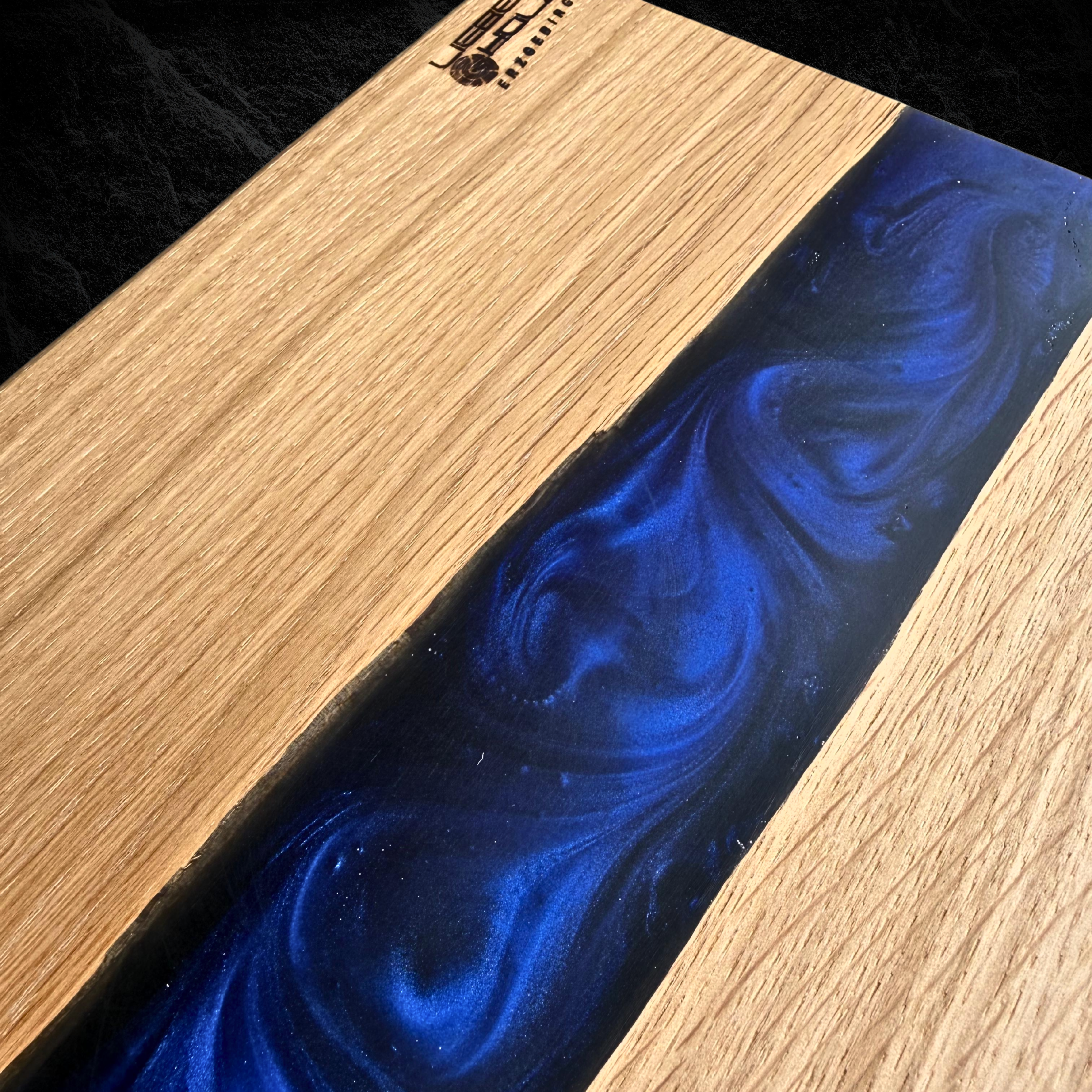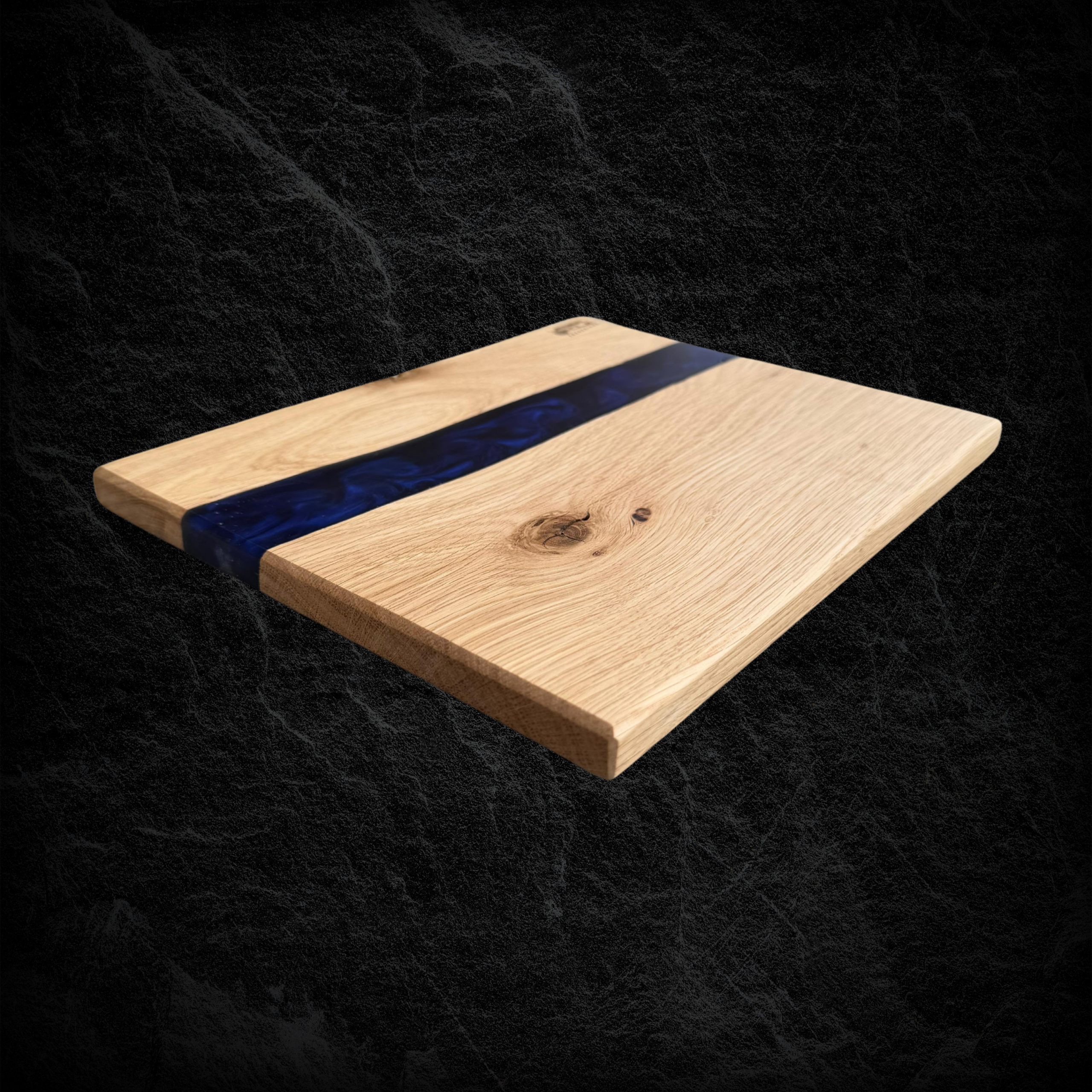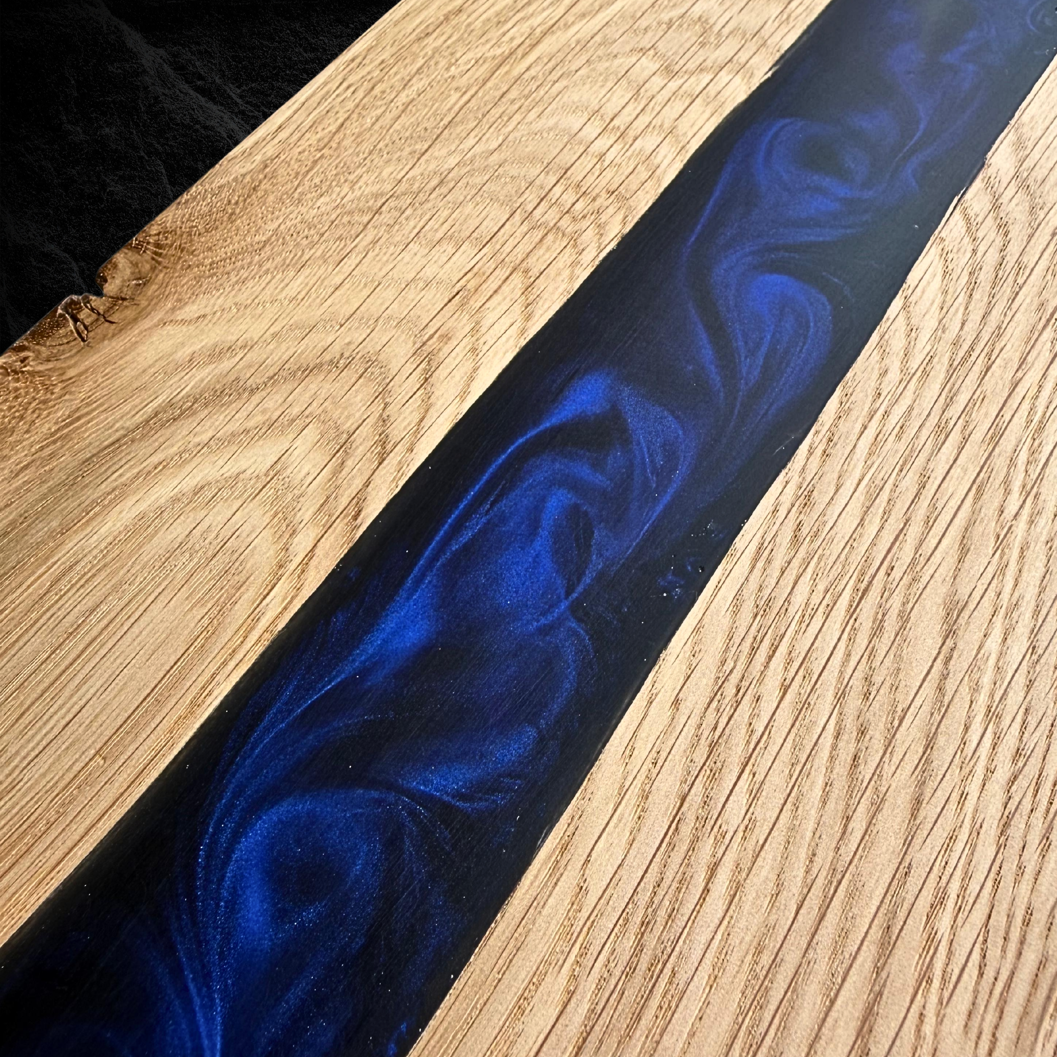 Hochwertiges Servierbrett aus Eichenholz, kombiniert mit blauem, schimmerndem Epoxidharz.