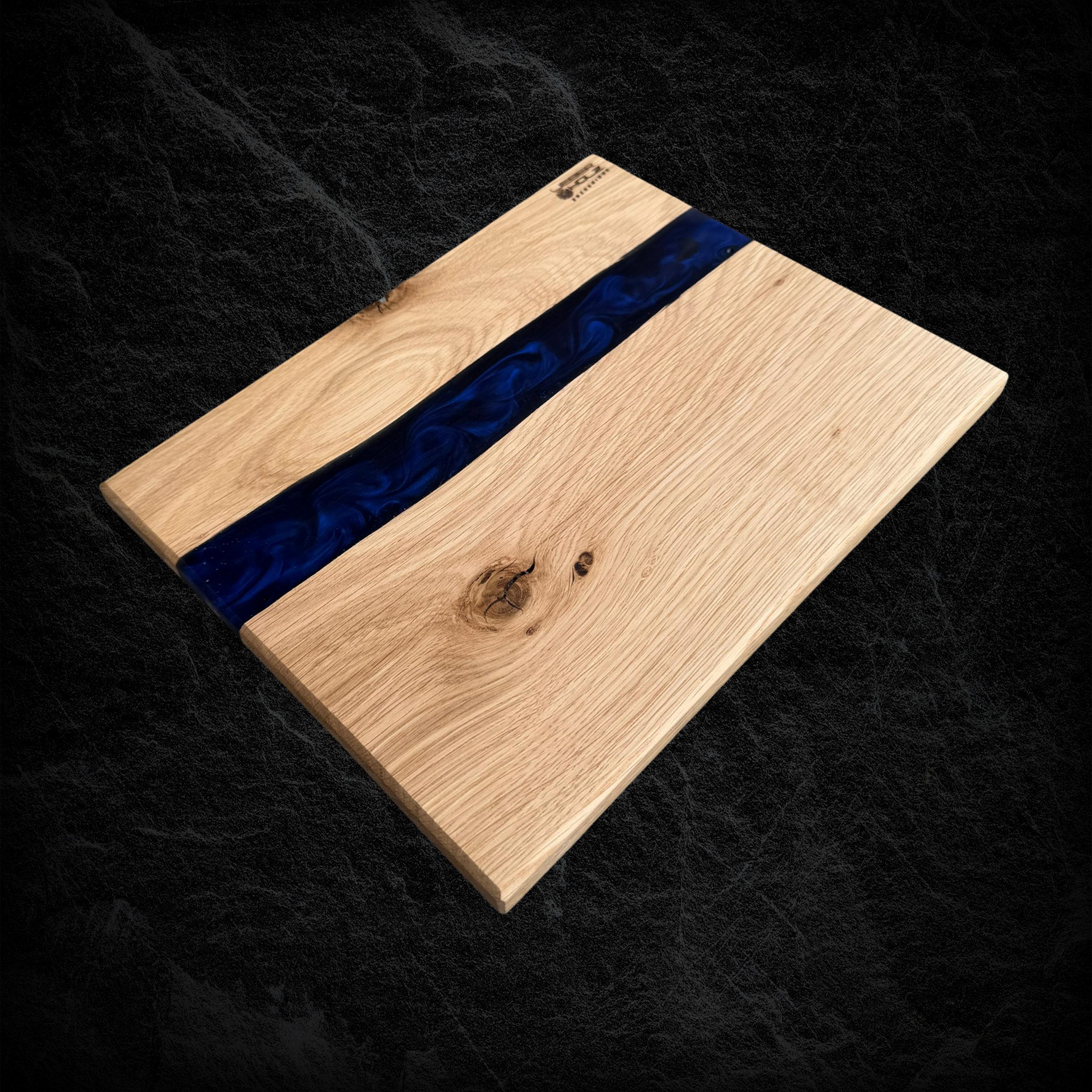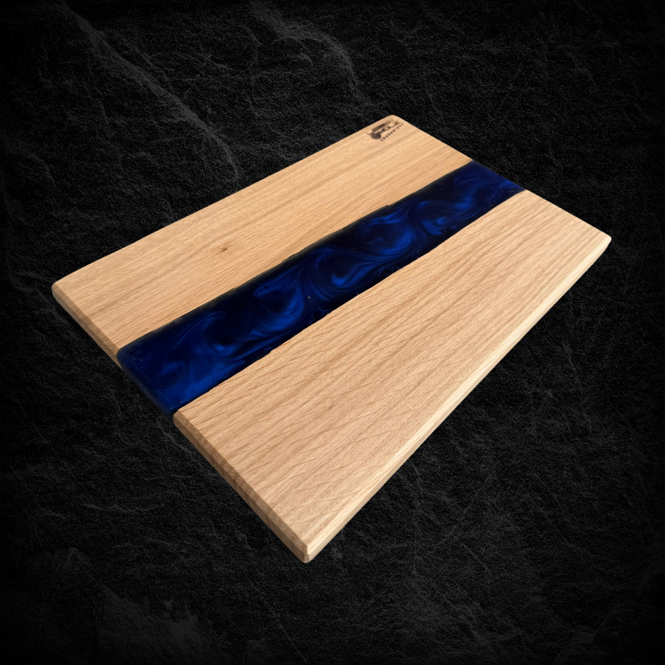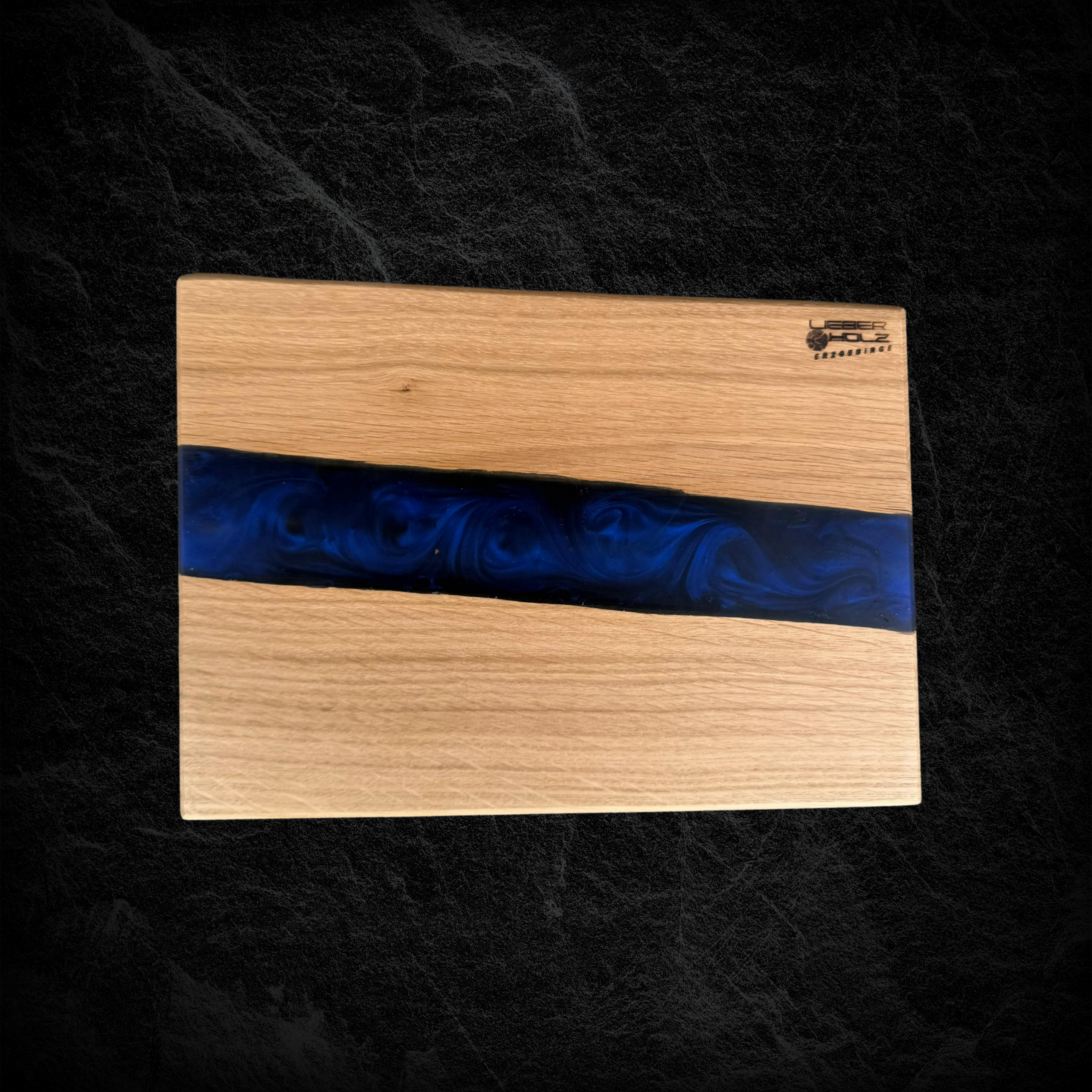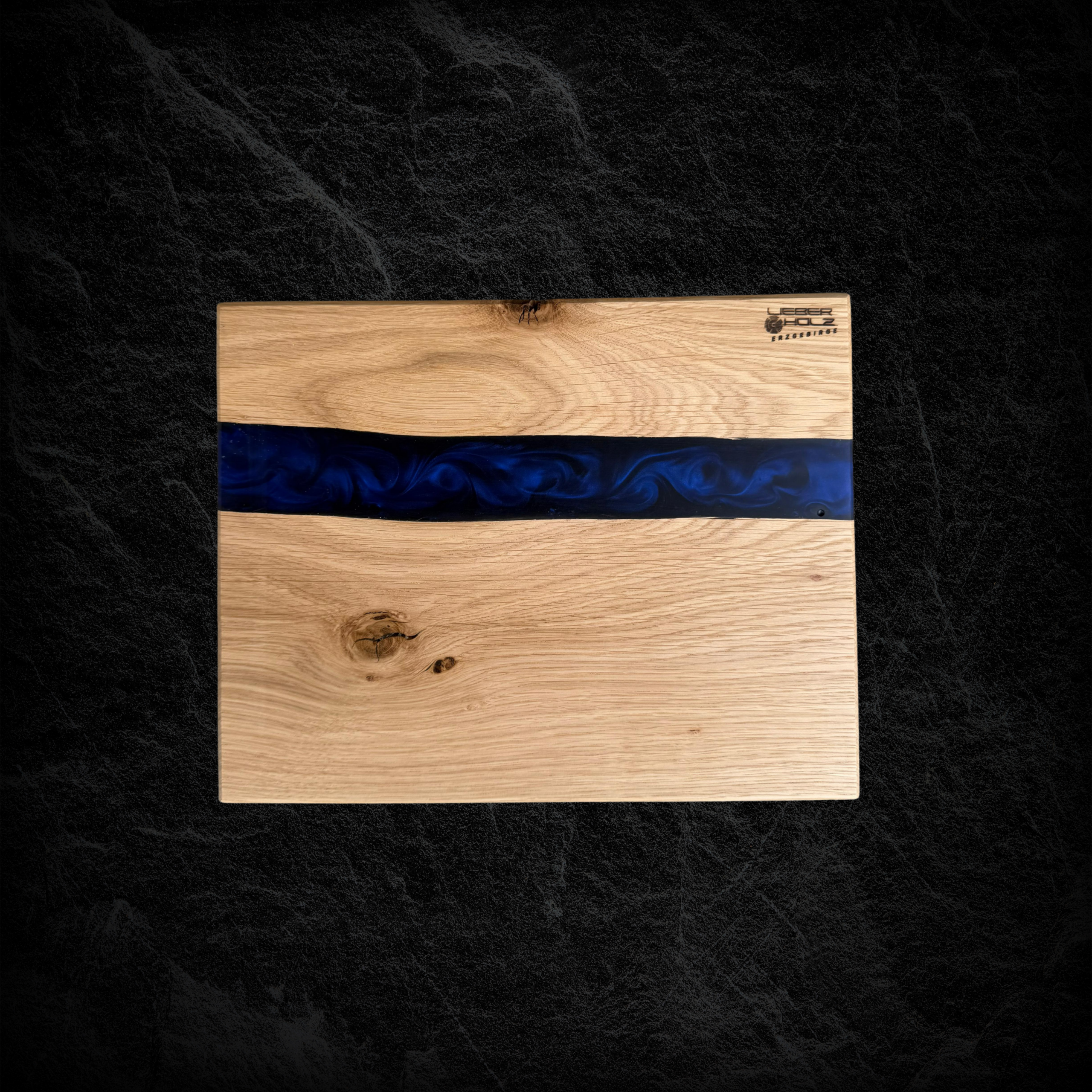 Hochwertiges Servierbrett aus Eichenholz, kombiniert mit blauem, schimmerndem Epoxidharz.