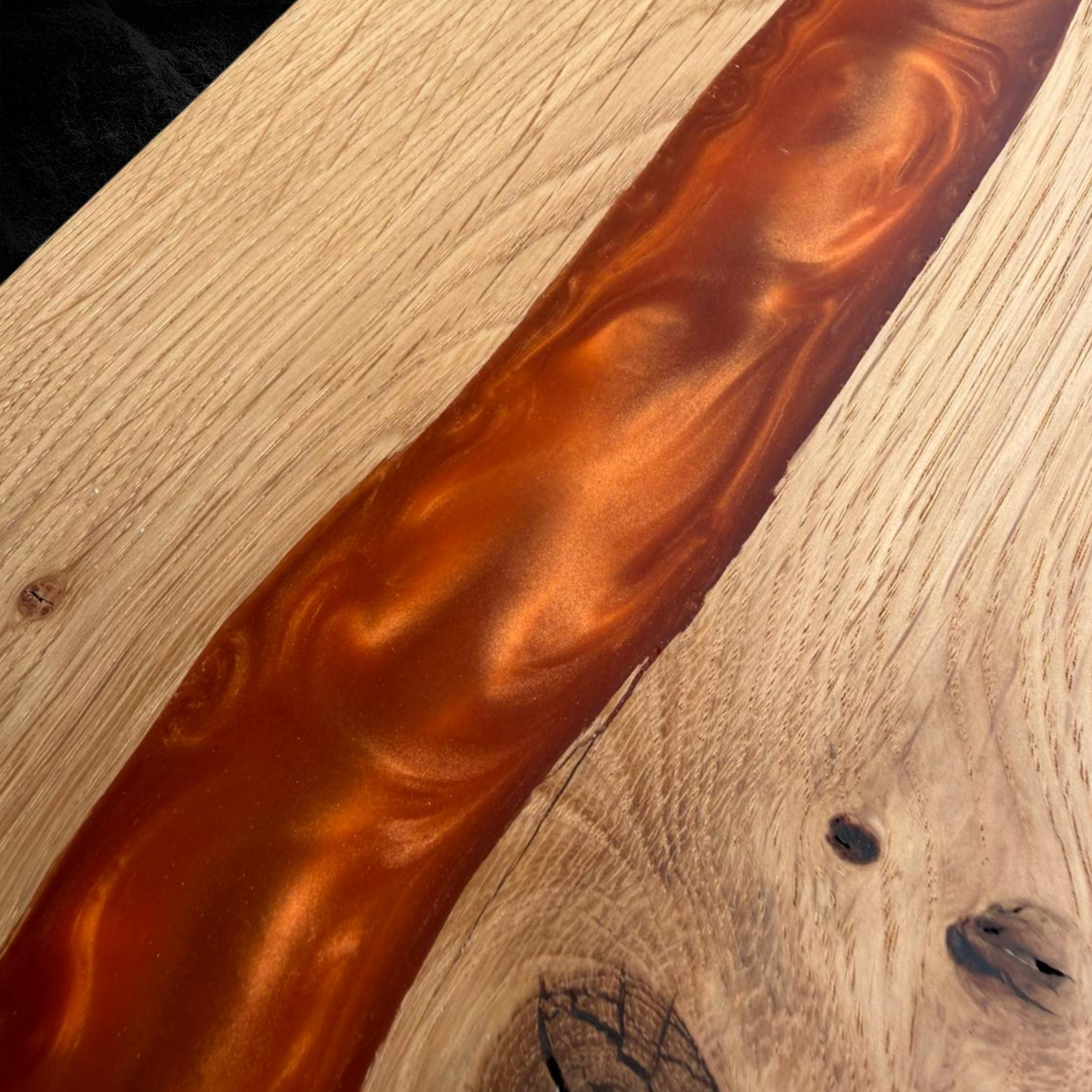Hochwertiges Servierbrett aus Eichenholz, kombiniert mit orangenem Epoxidharz.