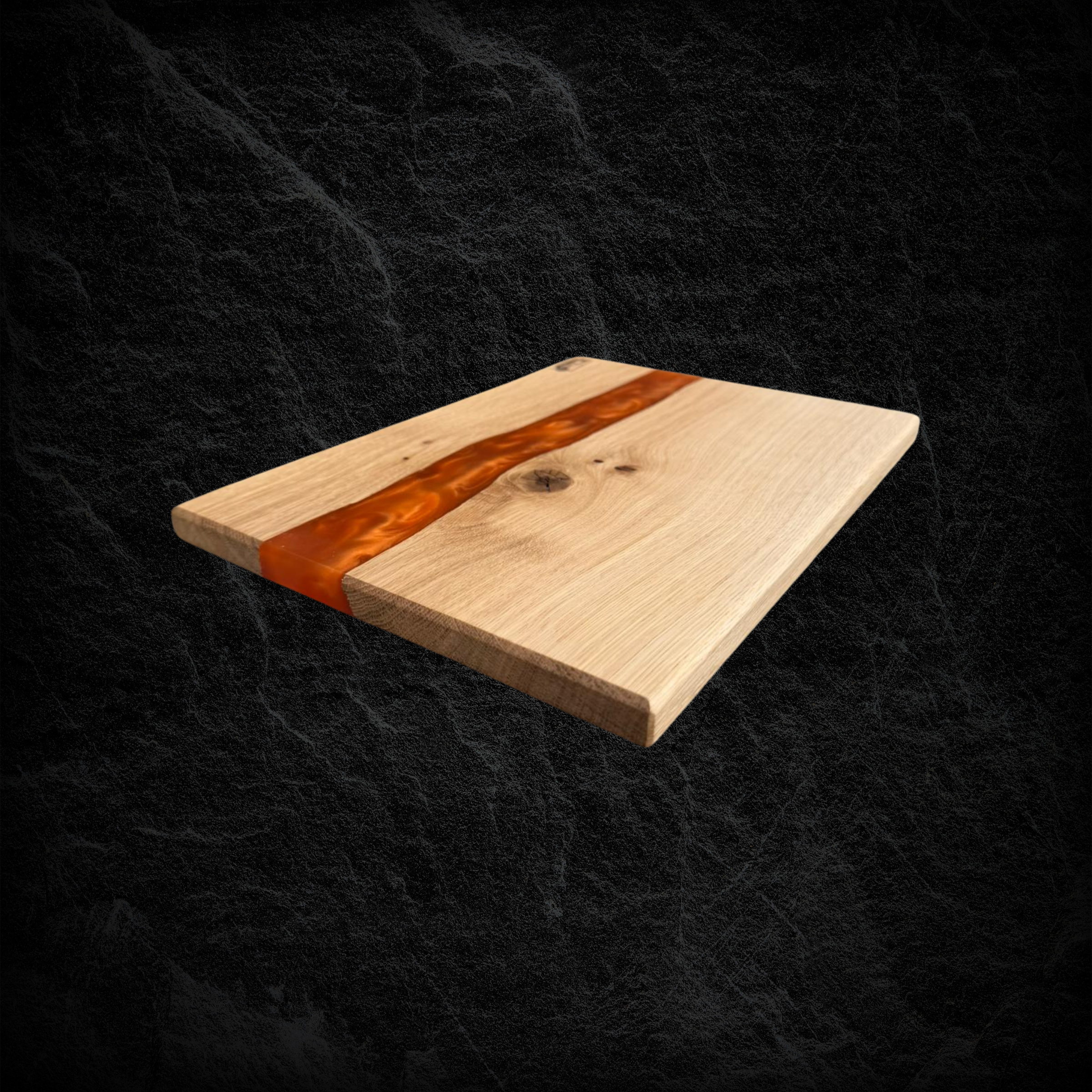 Servierbrett aus Eichenholz mit orangenem Epoxidharz. Warmer Farbton und natürliche Maserung machen jedes Brett zum Unikat – hochwertig verarbeitet und langlebig.