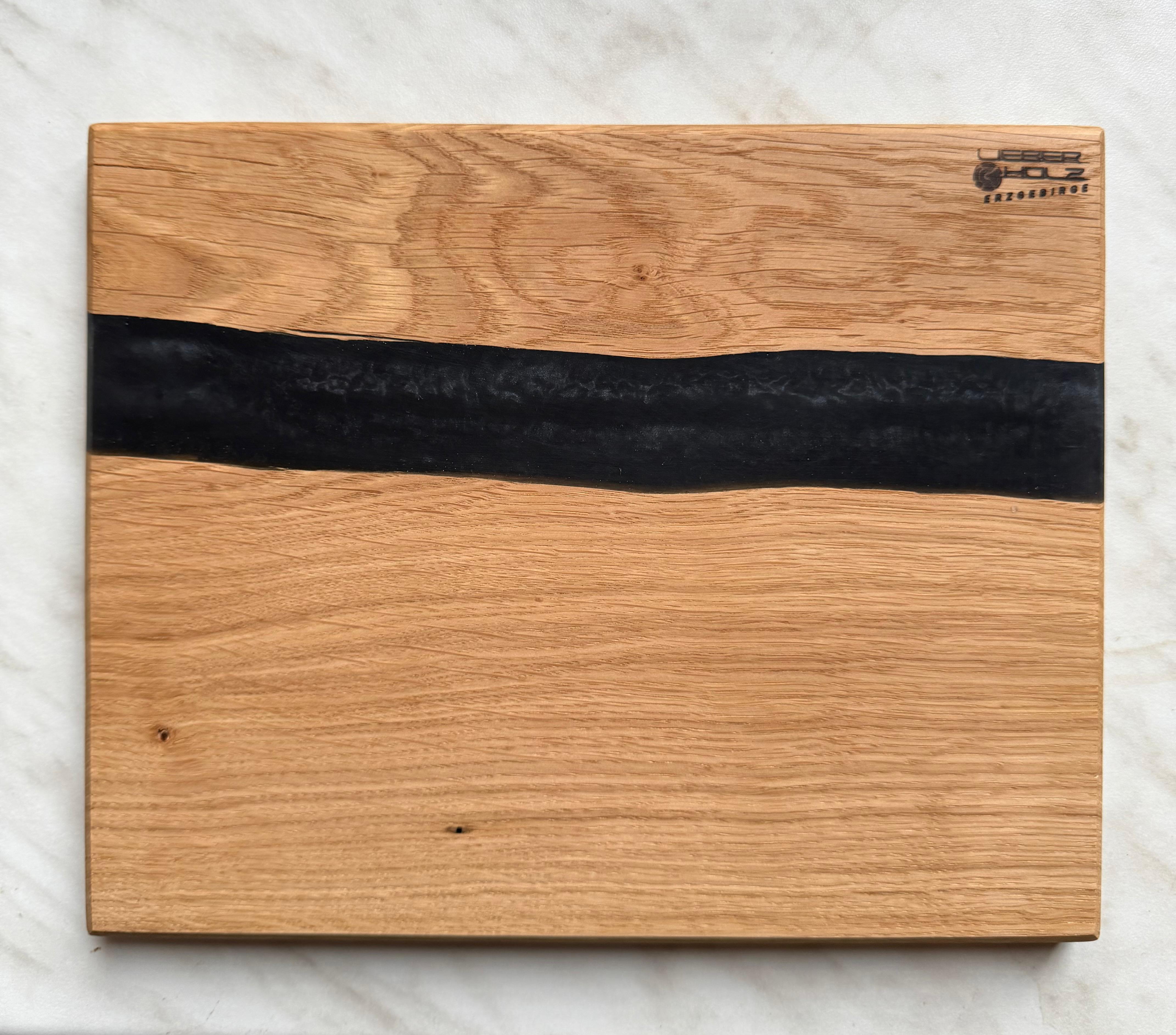 Hochwertiges Servierbrett aus Eichenholz, kombiniert mit schwarz schimmerndem Epoxidharz.